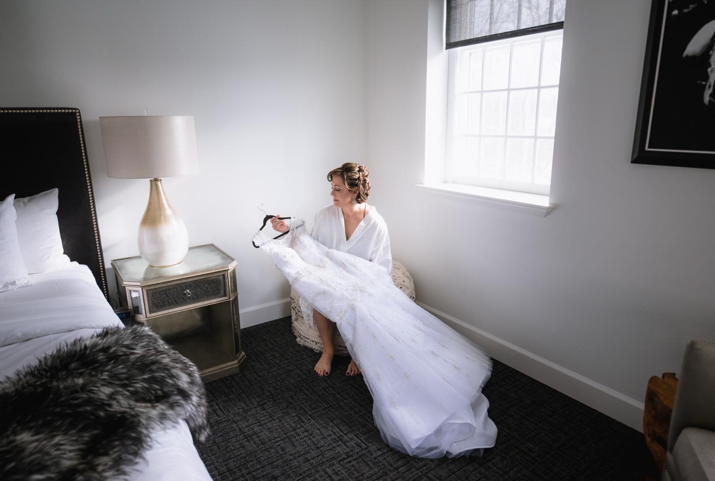 Even when you’re warm and can stand the temperature, it’s not exactly practical to walk around in the snow when you’re wearing a wedding dress. Fortunately, at the Delafield Hotel, you can walk outside of the front porch and see a row of beautiful evergreen trees. I’ve always been a sucker for that beautiful green to frame patches of white snow. And it didn’t take me long to find that opportunity at the hotel.