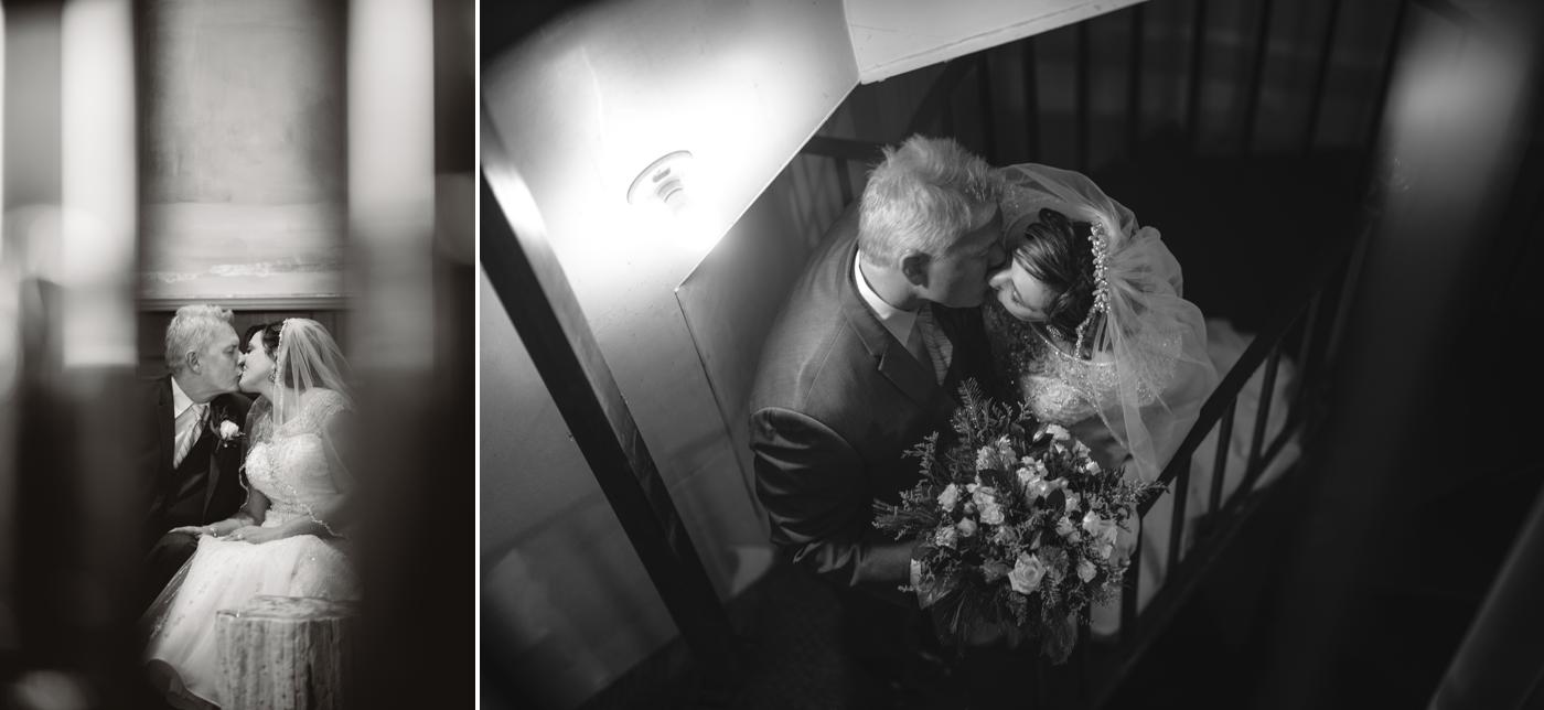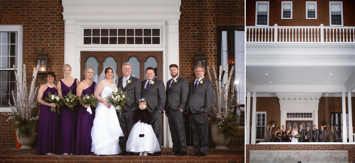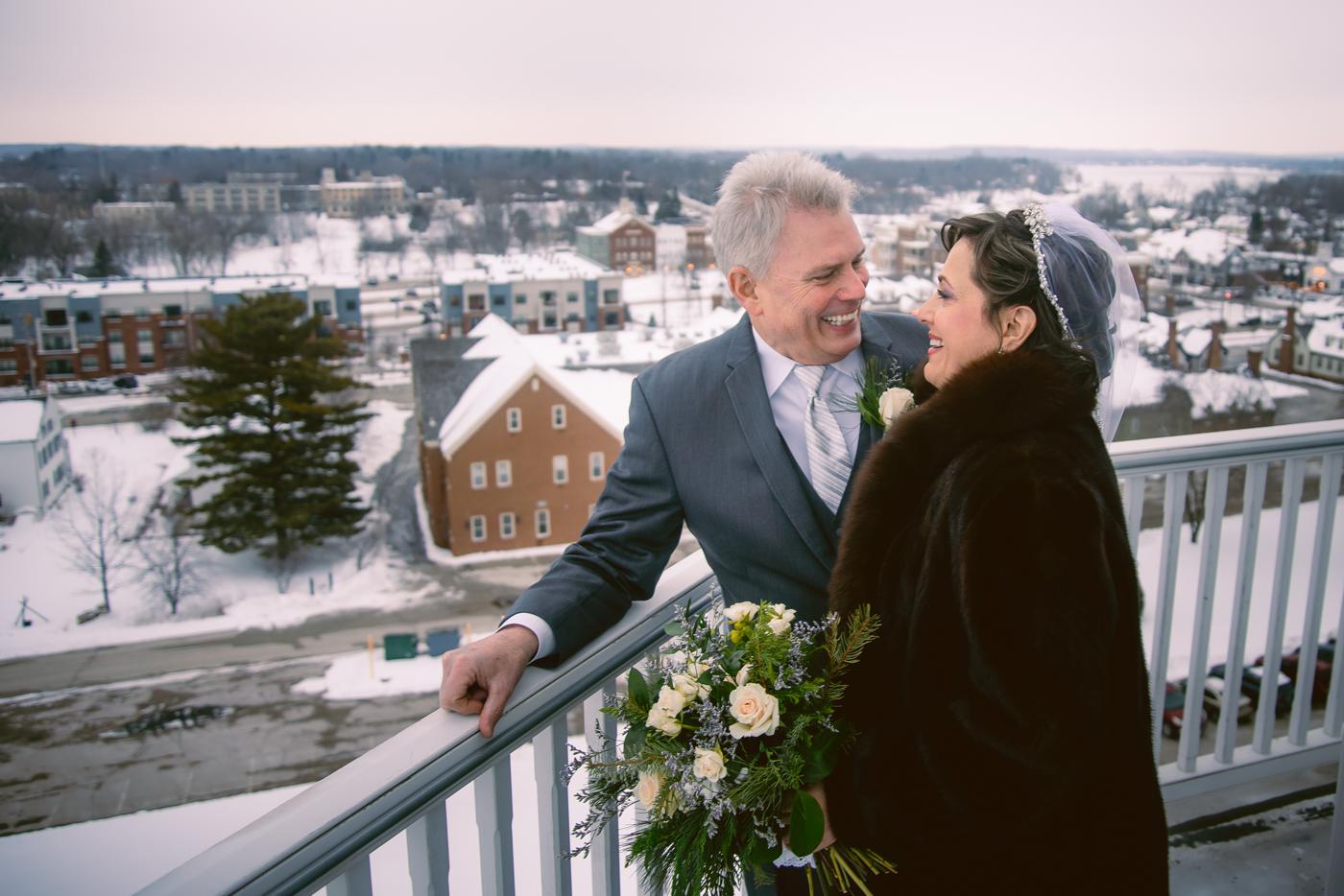 Sarah and Steve’s wedding day was chilly with fresh (but not too fresh) snow on the ground at the Delafield Hotel. The beautiful thing about their plan was that they got ready up in the hotel rooms, which are super stylish in that bold industrial/rustic looking way. The ceremony was held downstairs in the ballroom, where I took photos. And then we headed upstairs in the bell tower and right outside on the front steps of the hotel.