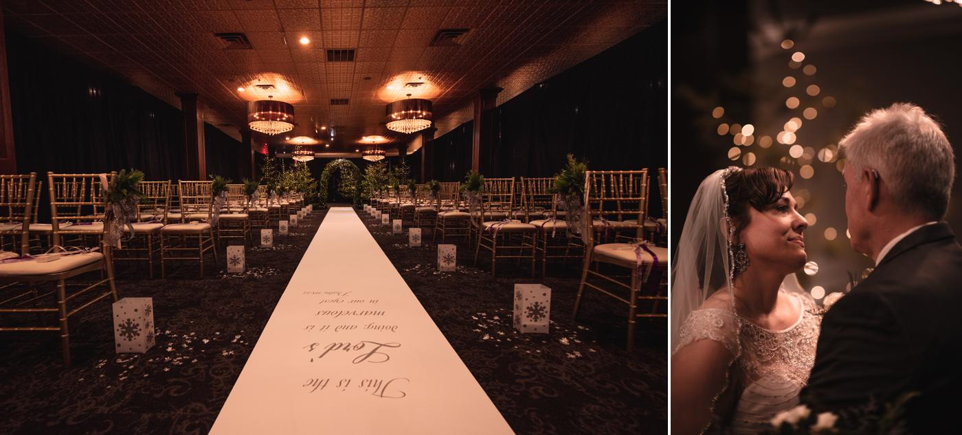 Sarah added a ton of lovely additions and decorations to her wedding, including a dozen Christmas trees from Rhinelander (Steve’s hometown) that she placed in the Delafield lobby at the beginning of the wedding aisle. She put them in potted bags and created an indoor forest for her processional and recessional. It was an amazing touch and I had never seen something like that. If anyone else is planning a wedding around the holidays, they should definitely create a Christmas tree forest inside. It was the best of both worlds: You have the serenity of a secluded forest scene with the smell of evergreen and the warm and snuggly atmosphere of being inside during the cold weather months.