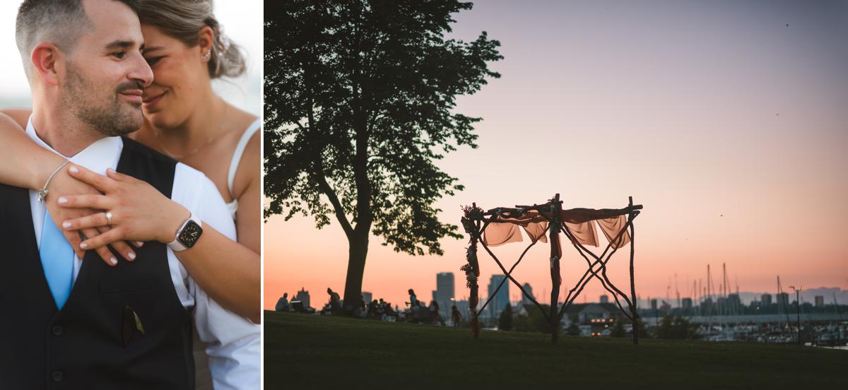 Alissa and David chose a different spot that gave you a higher view of the Milwaukee skyline and Lake Michigan. It was immediately north of the pavilion higher up on a grassy hill. For their wedding they had built their own wooden arch. It was rustic, made of branches and they had quite the story of how they had to haul the arch by draping it over their vehicle and driving it all the way from their house through Bay View to the wedding.