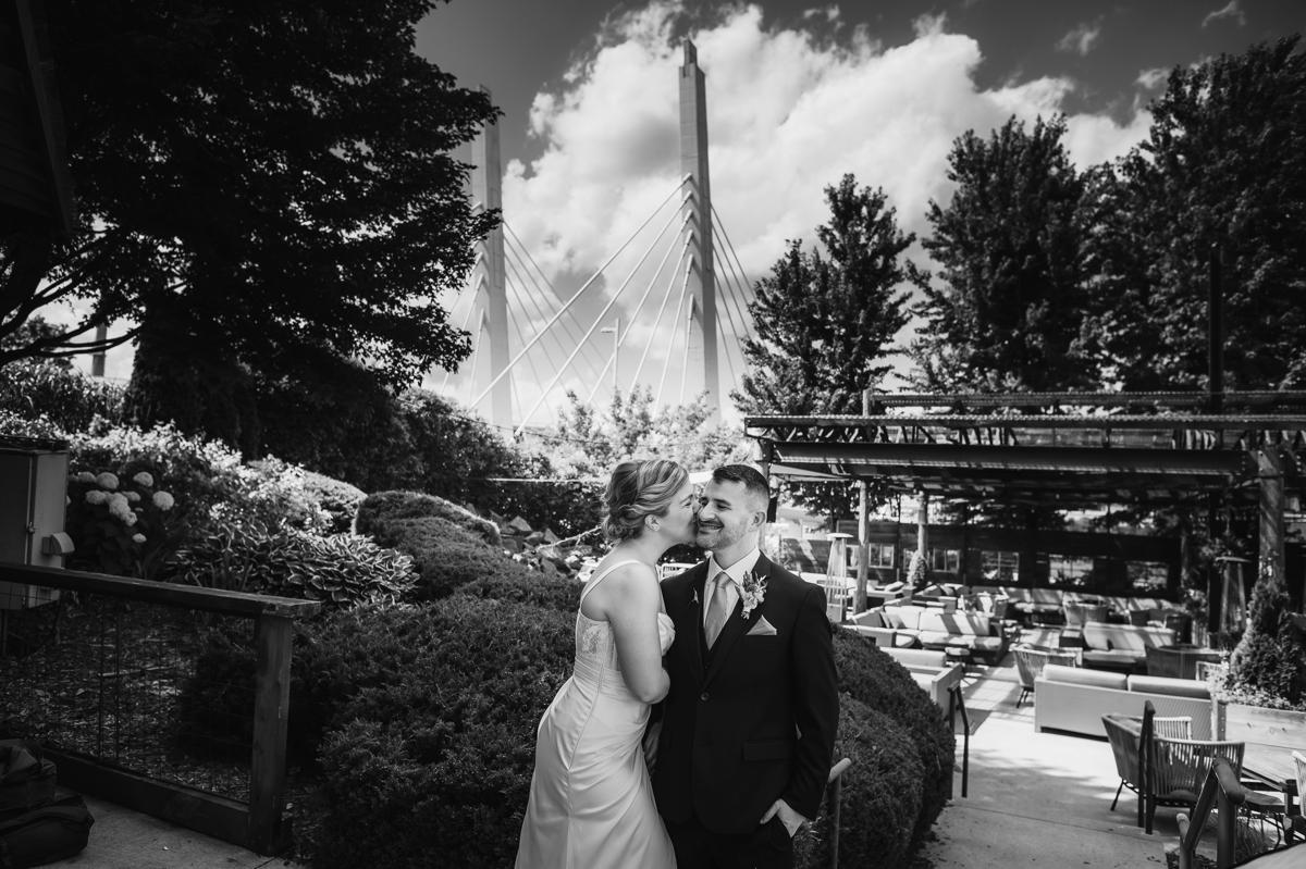 Alissa and David had decided to do their first look outside of the hotel and before the ceremony. I loved this, because the hotel had a huge patio area with the bridge in the background. You could just make it out in between a patch of trees and I made sure to get a couple portraits with them in the foreground.